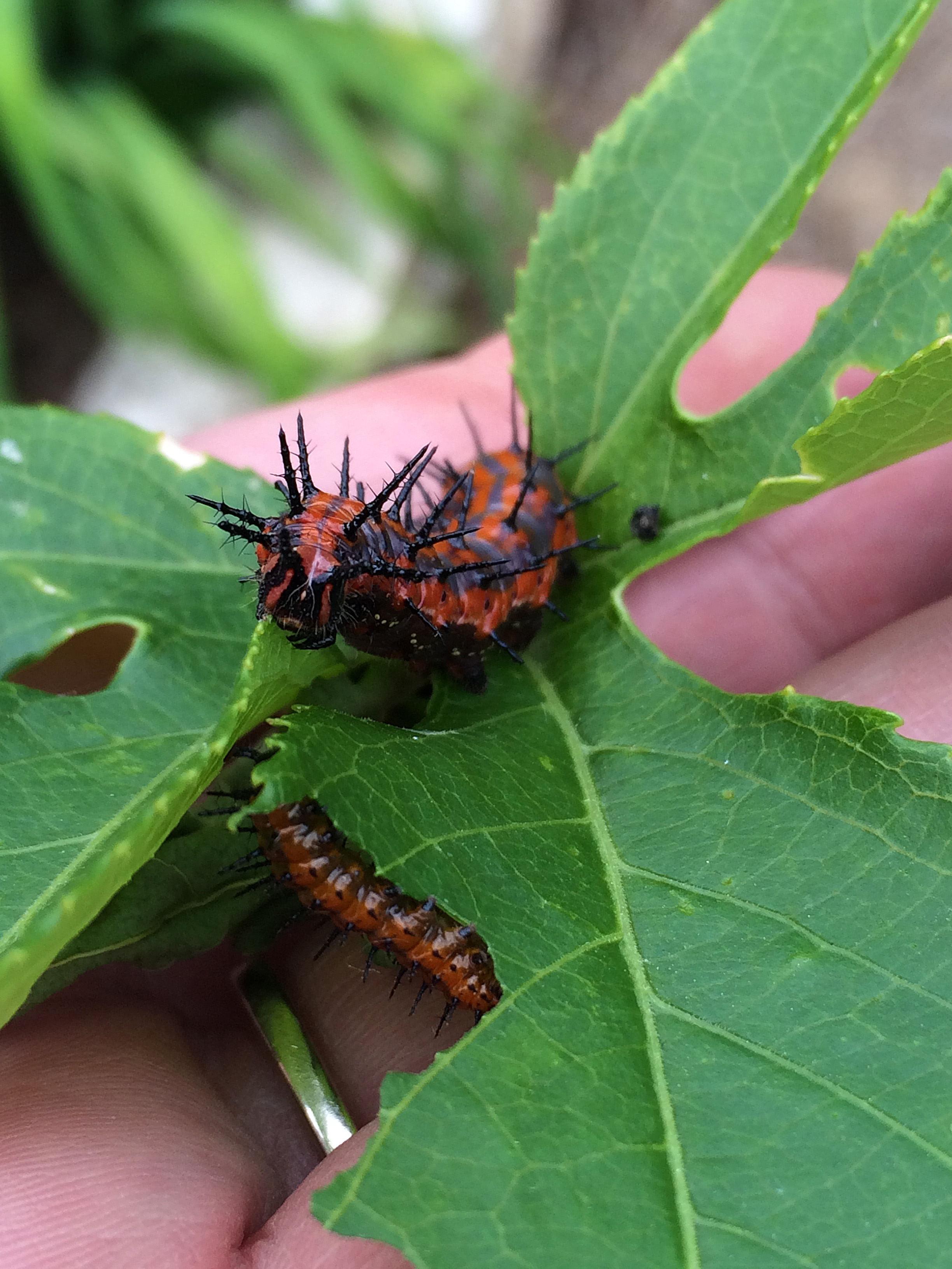 Last summer I planted passion vines on a trellis behind my raised bed garden.  It was an attempt to provide shade from the hot afternoon sun.  They did well, but froze back over the winter.  This spring they sent out runners and started climbing again, but this year we have an abundance of Gulf Frittilary Butterflies  that are seeking out these vines,  and their larva apparently love eating it.  I am torn between removing them from the vine by hand to save the plants or allowing them to happily eat to their heart’s content and hope the vines recover afterwards.  I have settled on doing a little bit of both.   If I can keep the vines alive, my hope is that in a few years there will be enough vines to host the butterflies and enjoy the beautiful flowers.