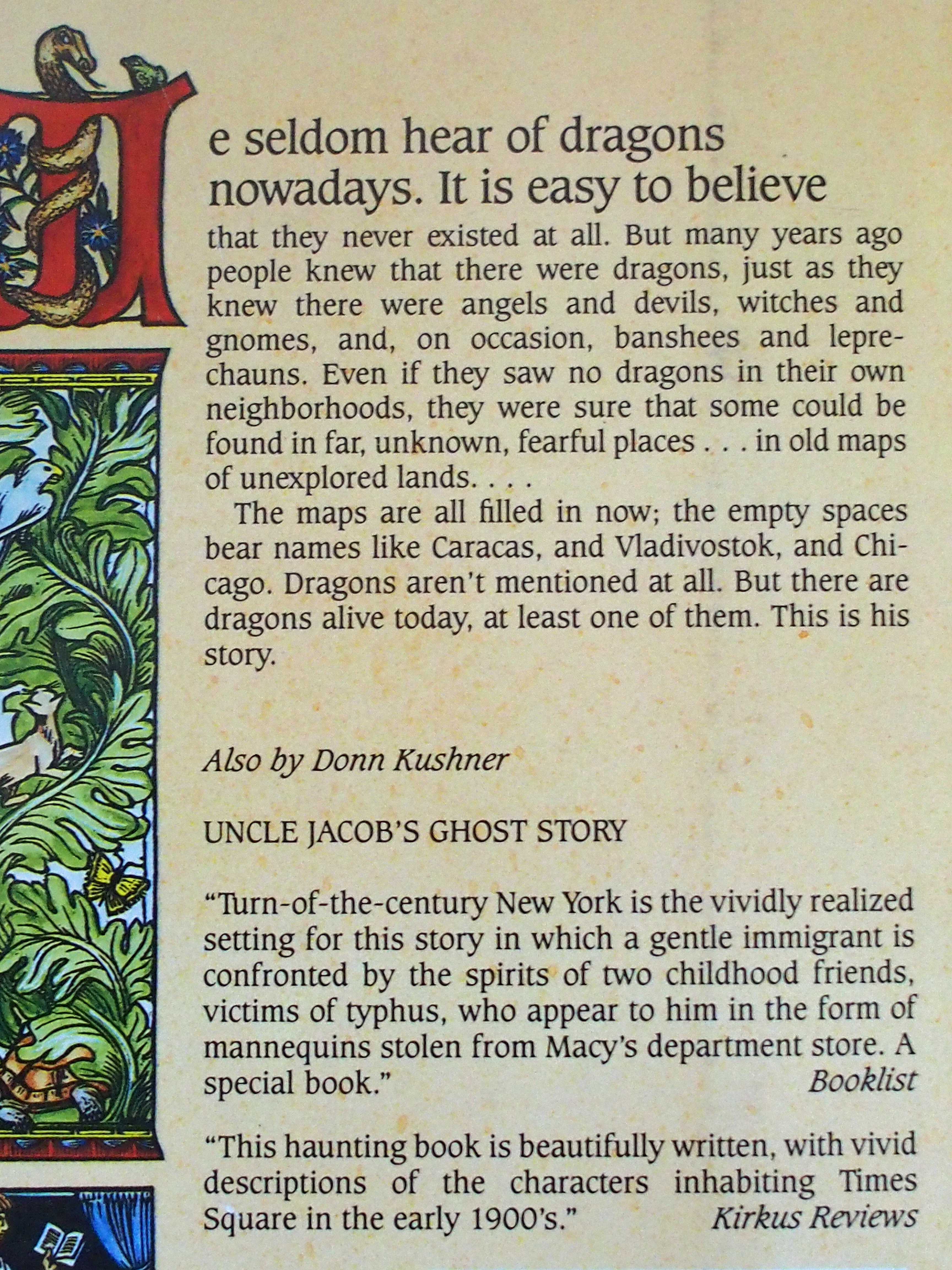 Last week I decided to have some fun with my logo, Albert Phineas Drache.  The awesome Catherine Dair created him and I decided it was time to get a little creative myself.  I love the saying “I’m a Book Dragon! Not  a worm”.  I have seen this all over the internet and thought to search it’s origin.  What I found was a lovely book titled A Book Dragon by Donn Kushner.  This most likely has absolutely nothing to do with the saying other than it is a book loving dragon.   I found the book used on Amazon and bought the hardback edition with dust jacket.  It is in great condition.  I received the book yesterday and have not had time to read it.  I am very excited.  The illustrations are beautiful.