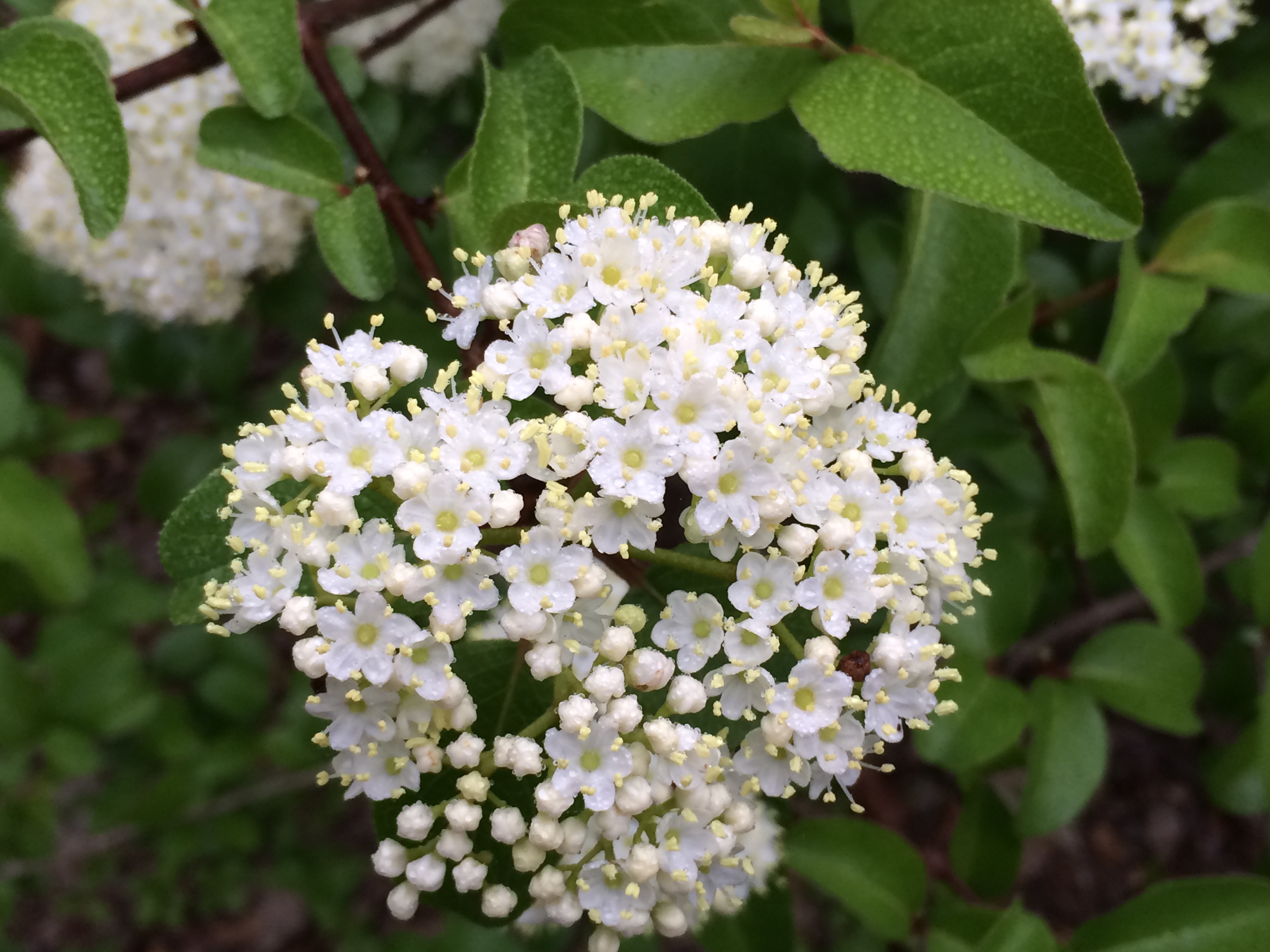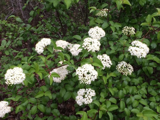Blackhaw Viburnum.  I love the clusters of white flowers and the bees appreciate them too.