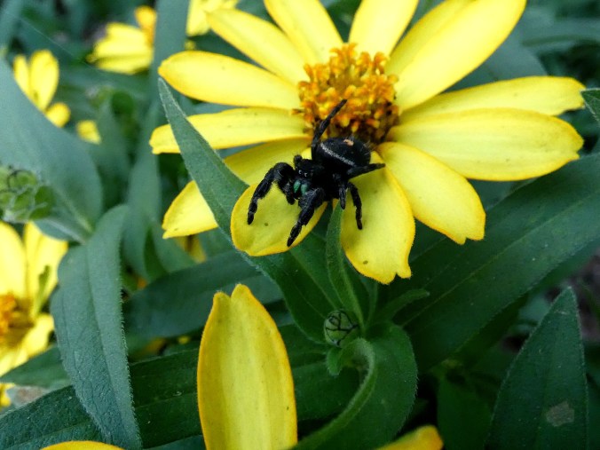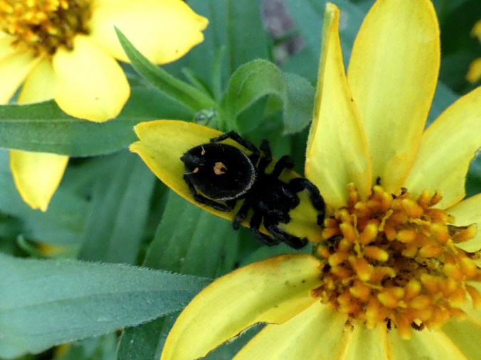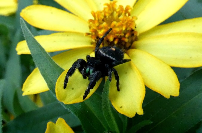 I was cutting basil in the garden the other morning and had not brought a basket with me, so I carried the armload of fragrant herbs into the kitchen clutched to my chest so as not to drop any. I then washed it in the sink. Much to my surprise, when the water drained there was a small black spider sitting in the bottom of the sink, looking rather put out. I know it as a fuzzy jumping spider. It’s official name is Phidippus audax. They are common around here and I love their colorful, iridescent chelicerae (mouth parts), which are a lovely teal green on this young spider. I read that the marking may be orange tinted in juveniles (wiki). The ones I usually see have white markings.