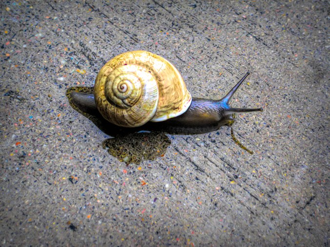 I started playing around with the photo in Topaz Studio (procrastinating), and thought that the snail and I had something in common. Moving slowly, although I think it would have beaten me today. This may be a three or four cup of coffee morning. 😉