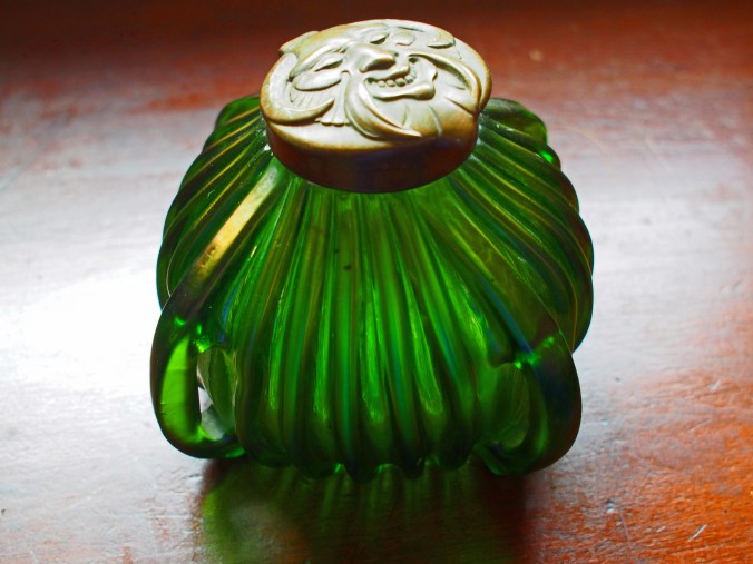 This inkwell was one of them. I love the dark green glass. It has an iridescent sheen to it like carnival glass. The cap is brass. If you know more about this piece, the age, maker, please comment below.