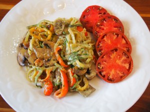 Creamy vegan basil pesto with mushrooms and peppers over zucchini noodles with Black Krim tomatoes from the garden.