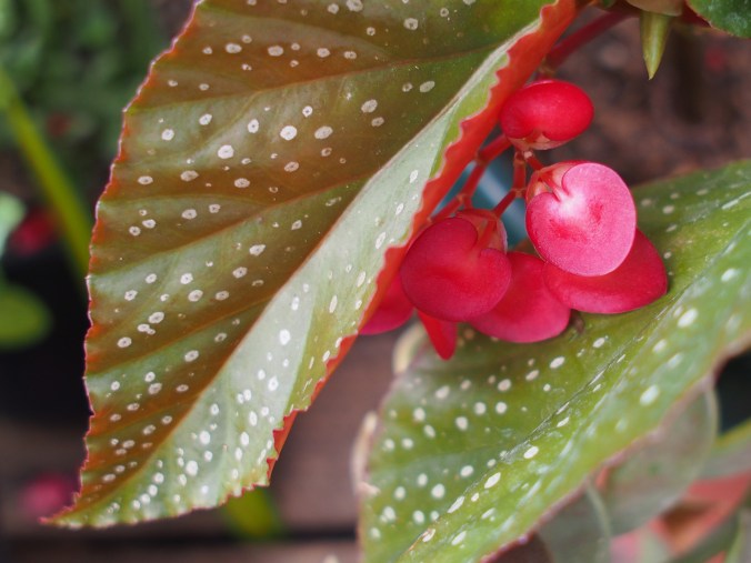 Angel Wing Begonia in pot with other rooted cuttings. The plant to the left is a Kalanchoe. It was also rescued from the thrown away pieces.